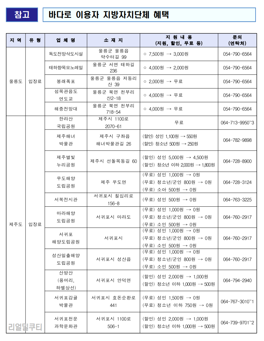 울릉도 및 제주도 지방자치단체 입장료 제휴 할인 가능합니다.