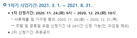 - 1차 신청기간은 2020년 11월 24일 9시 부터 2020년 12월 29일 18시 까지입니다.