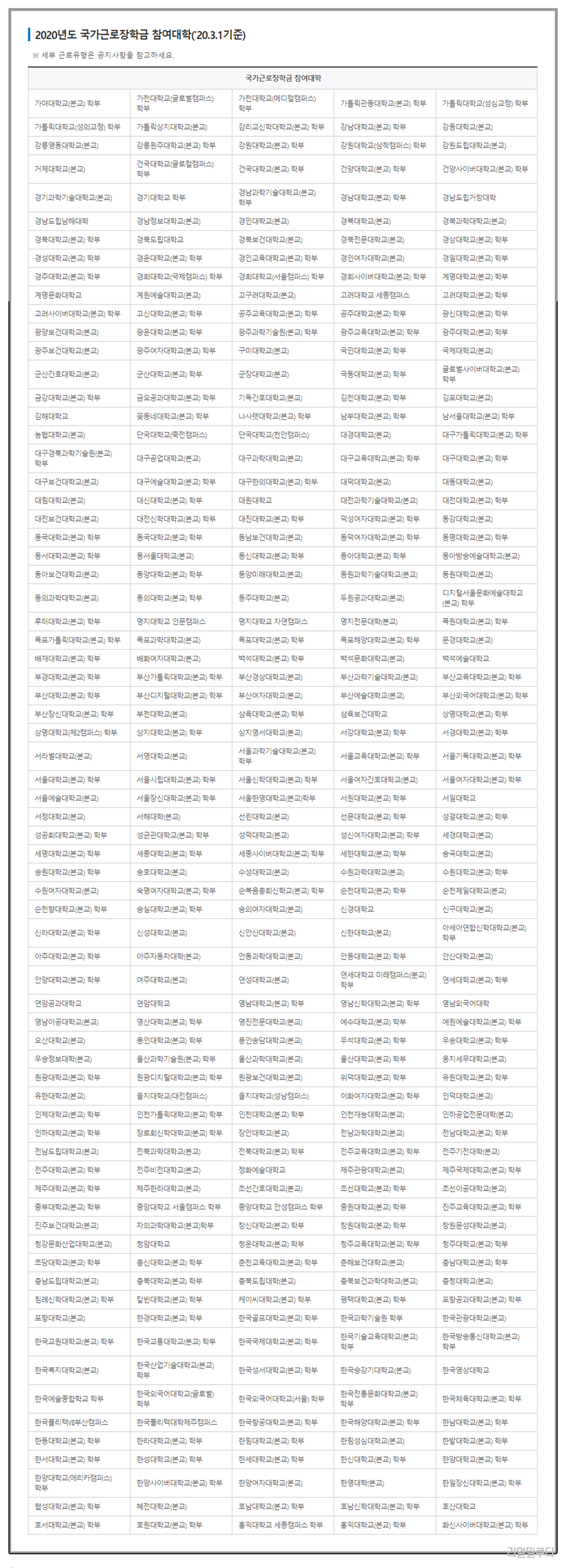 *2020년도 국가근로장학금 참여대학은 아래와 같습니다. (스압주의😅)