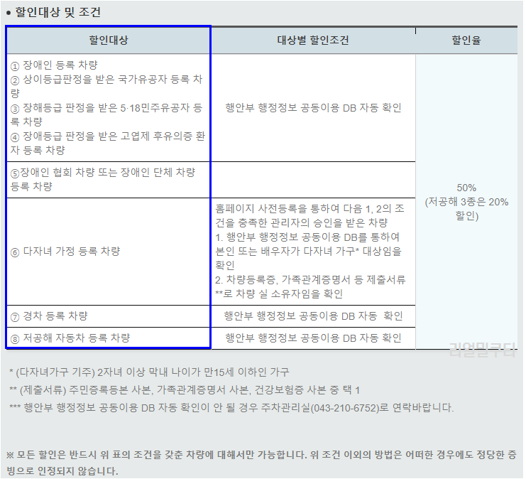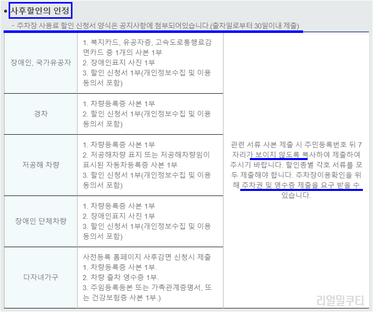 주차요금 할인 대상은 아래와 같으며, 복수개의 항목에 해당될 경우 1개만 적용이 가능합니다.