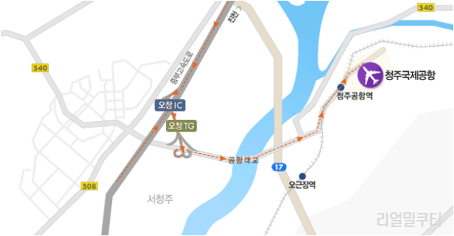 자차로 오실 땐, 540번 지방도 오창IC ~ 청주국제공항 방면으로 우회전하여 공항으로 진입합니다.