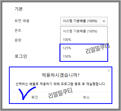 - 화면 배율에서 시스템 기본배율 100%가 기본 디폴트 값입니다.