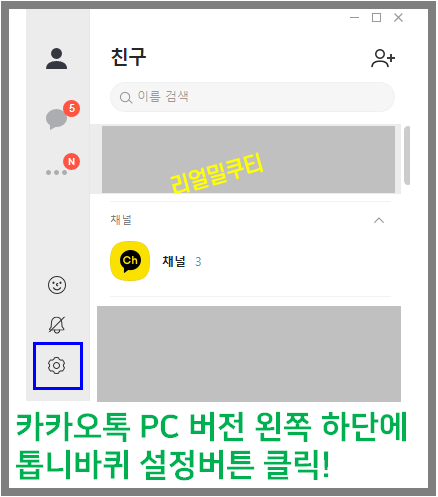 2. 카카오톡 화면의 왼쪽 하단에 보시면 톱니바퀴가 있습니다.