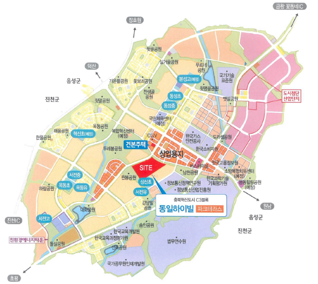 충청북도 진천군 동일하이빌의 위치는 충청북도 진천군 덕산읍 두촌리 3125번지입니다.