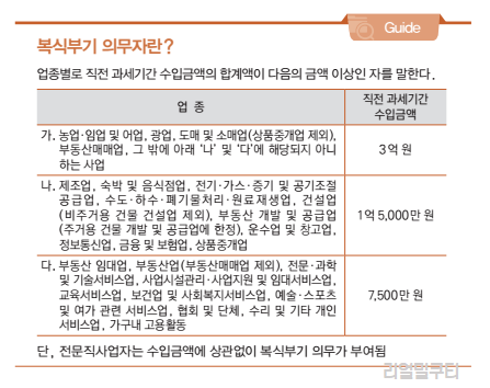 가~다 업종 및 수입금액을 참고하시되, 전문직사업자는 수입금액에 관계없이 복식부기 의무가 부여됩니다.