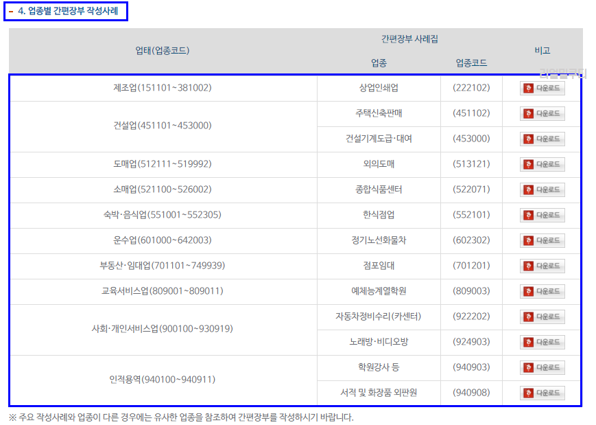 업태(업종코드)로 간편장부 사례집이 나누어져 있는데요.