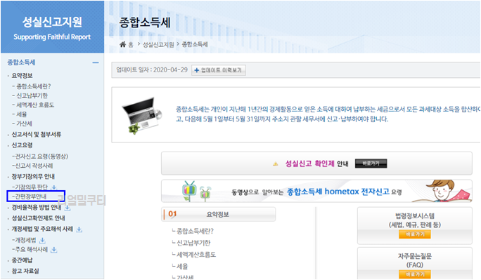 종합소득세 화면이 나오고, 왼쪽 메뉴에서 간편장부안내를 눌러주세요.