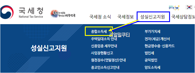 국세청 홈페이지 메인 화면에서 성실신고 지원 메뉴를 선택하면, 종합소득세가 첫번째에 나옵니다.