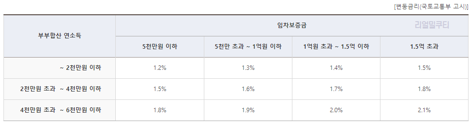 부부합산 연소득 및 임차보증금(전세금)에 따라 금리가 달라집니다.
