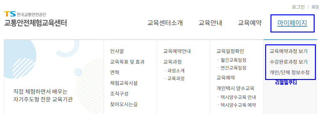 - 교통안전체험교육센터 홈페이지에 접속한다음, 마이페이지에 들어가세요.
