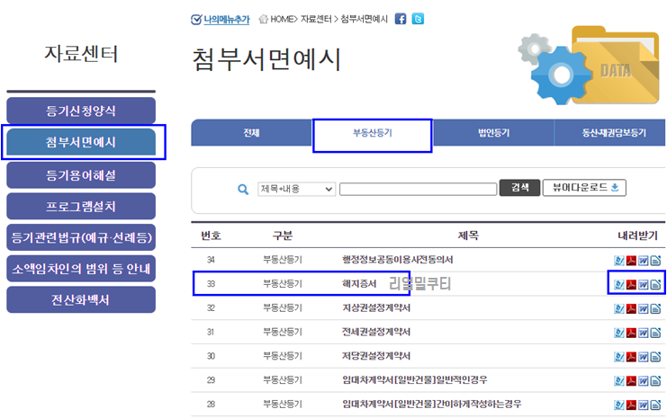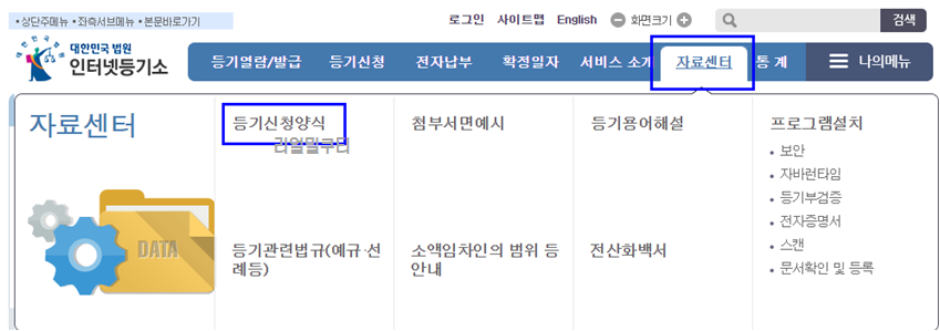 메뉴에 자료센터를 찾으신 후, 등기신청 양식을 클릭해주세요.