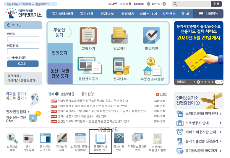 - 인터넷 등기소 메인화면에서 하단에 등록 면허세 정액분 신고를 선택해주세요~