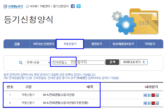 검색창에 전세권 말소를 입력하여 말소등기신청서를 다운로드 하시면 됩니다.
