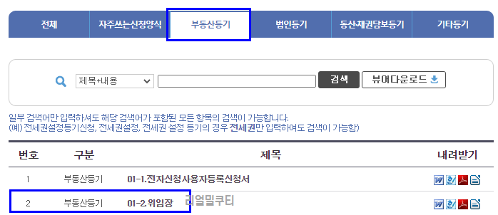 - 위임장도 인터넷 대법원 등기소에서 다운로드 받을 수 있습니다.