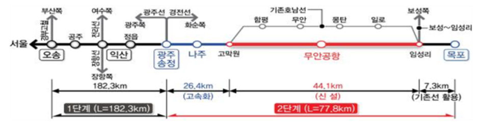 ‘호남고속철도 2단계 건설사업’은 전라남도 무안국제공항을 거쳐 지나는 고속신설 사업으로 무안국제공항을 활발하게하고 호남권 지역주민의 교통을 편하게 이용할 수 있도록 하여, 2025년 완공을 목표로 추진될 예정이며, 총 사업비는 2조 5,789억 원이 투입된다고 합니다.