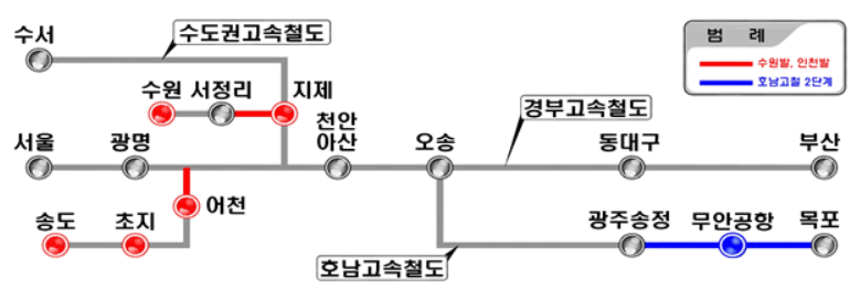 🔶국토교통부는 고속교통을 확장하는 호남고속철도 2단계(고막원~목포) 건설사업 및 인천발/수원발 KTX 직결사업 등 관련 공사를 연내 시작한다고 하였습니다.