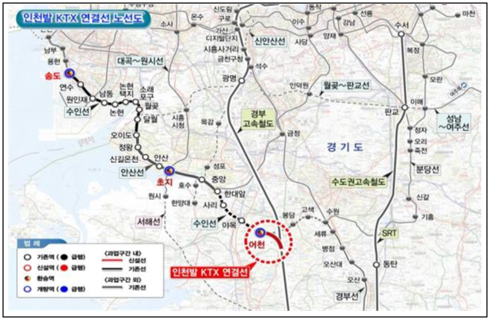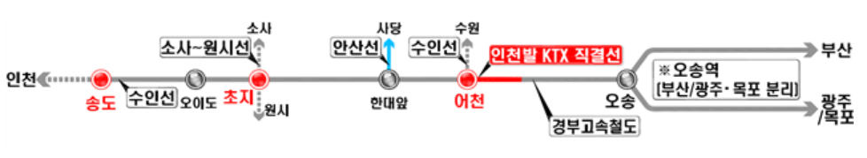 - 송도역(수인선) - 초지역(안산선) - 어천역(수인선) KTX 정거장