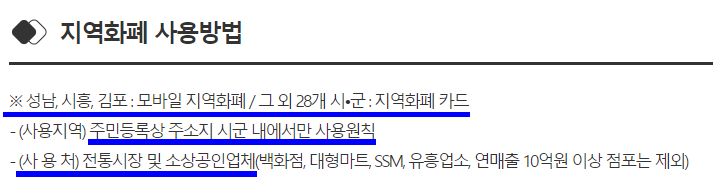 - [지역화폐 사용방법]은 지역에 따라 모바일형과 카드형으로 제공되는데, 사용하는 지역은 원칙상 살고 있는 주소지 시군내에서만 사용이 가능합니다.