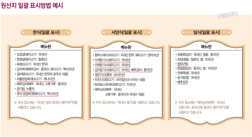 2) 음식점: 메뉴판, 게시판, 주간메뉴표 등에 표시(원산지표시판 대체 가능)