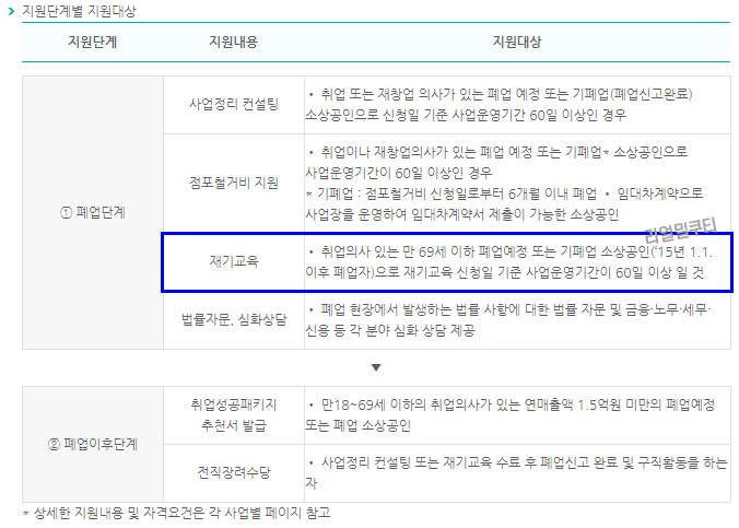 - 폐업 후 취업의사가 있는 소상공인에게 취업교육을 지원하여 취업역량을 높이는 것입니다.