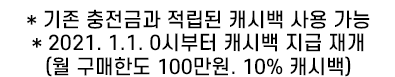 월 구매한도 50만원, 10% 캐시백 혜택이 다시 진행되며 적립된 캐시백은 기간과 상관없이 사용이 가능합니다.