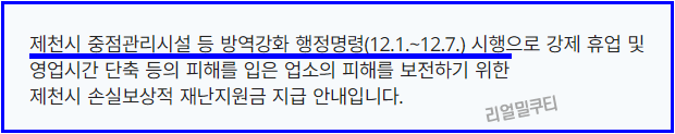 제천시 중점시설 등 방역 상태를 높이기 위한 행정명령 시행으로 12월 1일부터 12월 7일까지 강제 영업시간 단축 및 휴업으로 피해를 입은 사업체에 손실보상적 재난지원금을 지급한다고 합니다. 아래에서는 손실보상적 재난지원금 지원자격, 지원금 및 신청방법에 대해 알아보겠습니다. 🍀