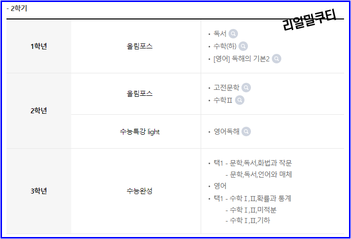 2학년 - 올림포스 현대문학, 수학I, '확률과통계, 미적분, 기하' 중 선택 1