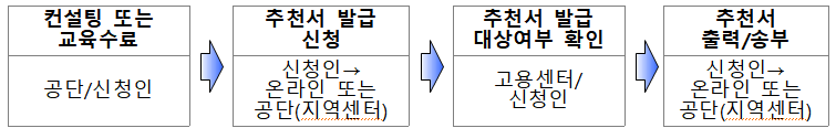 컨설팅 또는 재기교육 수료 후 -> 취업성공패키지 추천서 신청 및 발급 -> 공단에 추천서 출력