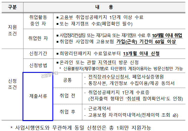 - 신청기간: 희망리턴패키지의 “사업정리컨설팅, 재기교육 및 재기캠프” 중 하나를 수료하고 수료완료일로부터 13개월 이내 신청