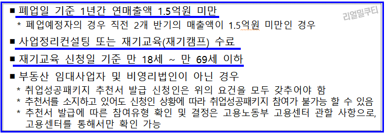 - 고용노동부 취업성공패키지 1단계 이상 이수 또는 재기캠프 수료(폐업확인 필수)