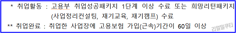 - 즉, 교육 이수 후 10개월 이내 취업을 완료하고, 근속기간이 60일 이상 되어야 함