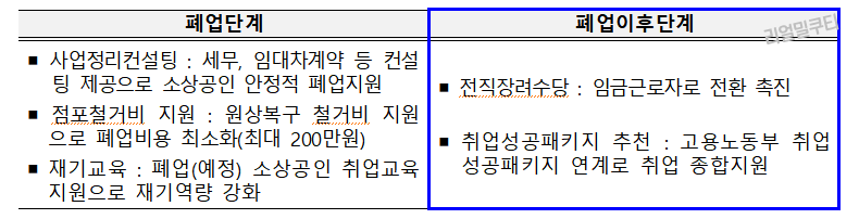 - 소상공인의 폐업으로 인한 충격완화 및 임금근로자의 전환을 지원합니다.