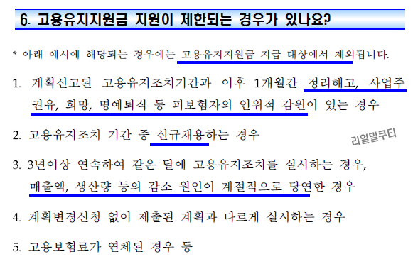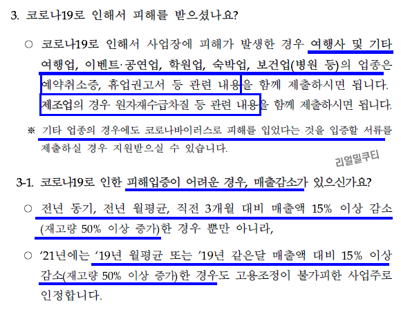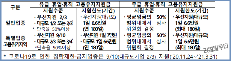 - 코로나19로 인한 집합제한 금지 사업장은 고용조정이 불가피한 사업주로 인정됨 (2021년 3월 31일까지)