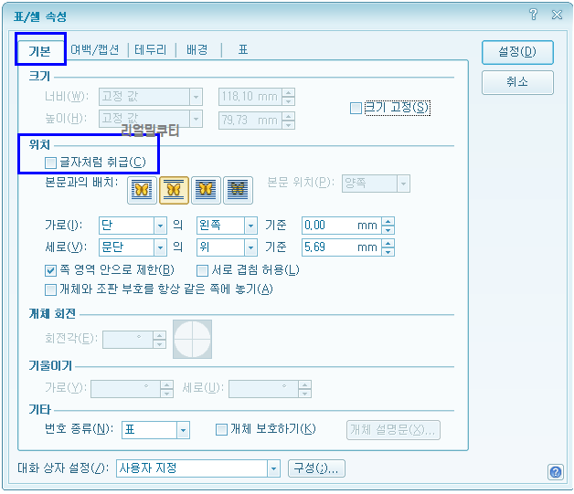 여기서 기본탭을 누르면, 크기 다음에 위치 항목이 있고, [글자처럼 취급]이 있습니다.