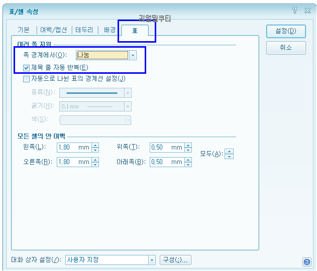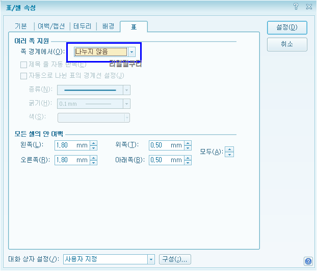 표 속성에서 ‘쪽 경계에서’ [나누지 않음]으로 되어 있는 것을 확인하실 수 있습니다.