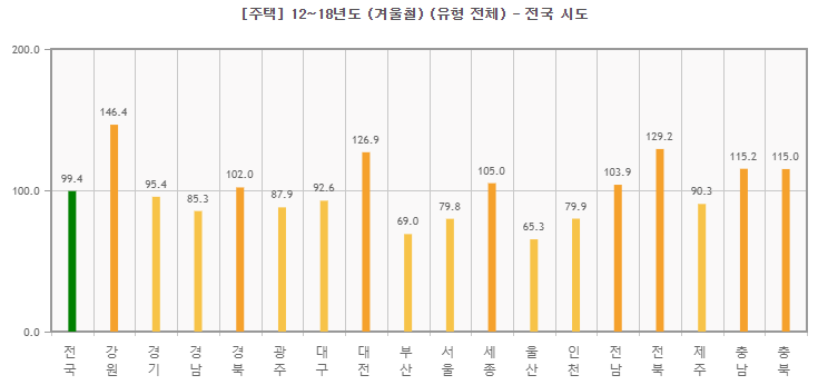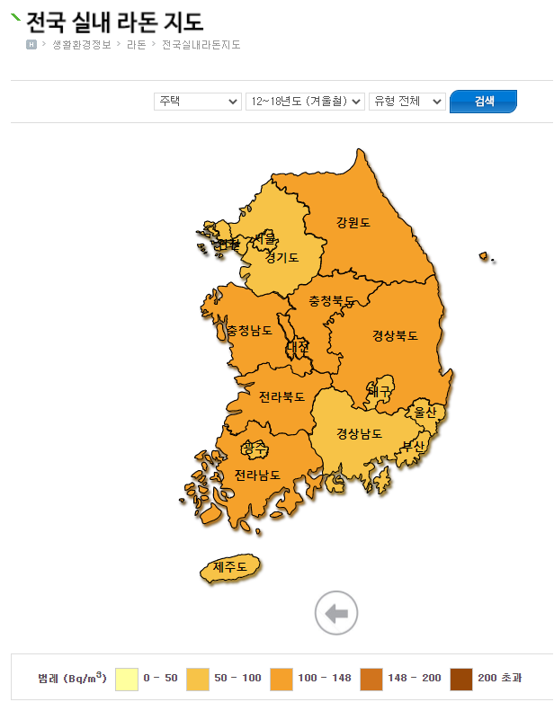 2012~2018년도 (겨울철) 전국의 대부분은 60-130 Bq/㎥, 강원지역은 실내 권고기준인 148베크렐 가까이 나와있는데요.