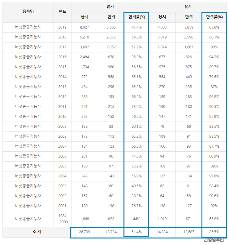 대체로 필기는 50%정도가 붙고, 실기시험은 80%이상이 붙습니다.