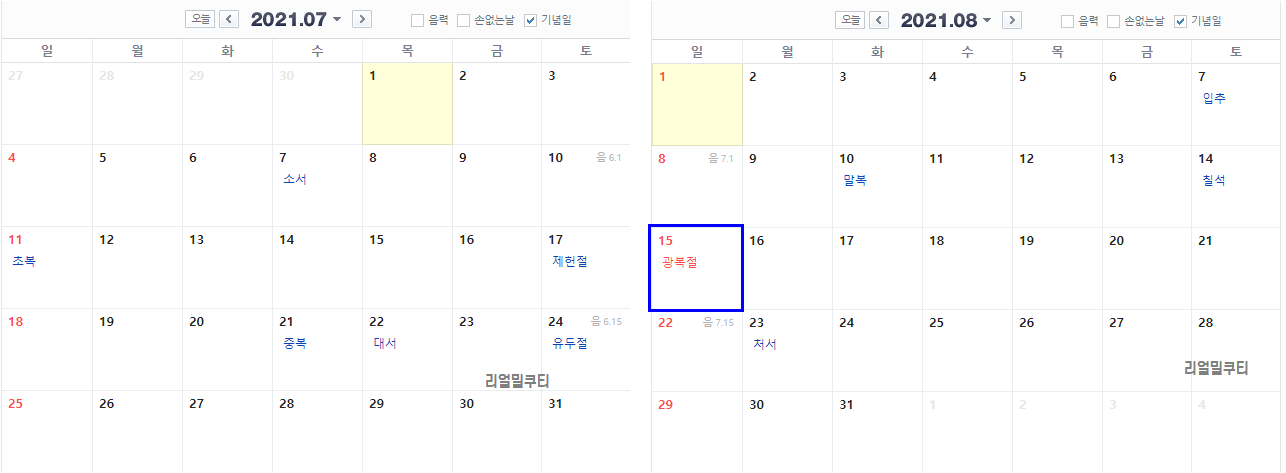 7월, 8월은 제헌절 7월 17일, 광복적 8월 15일이 있지만 모두 토요일, 일요일이예요.