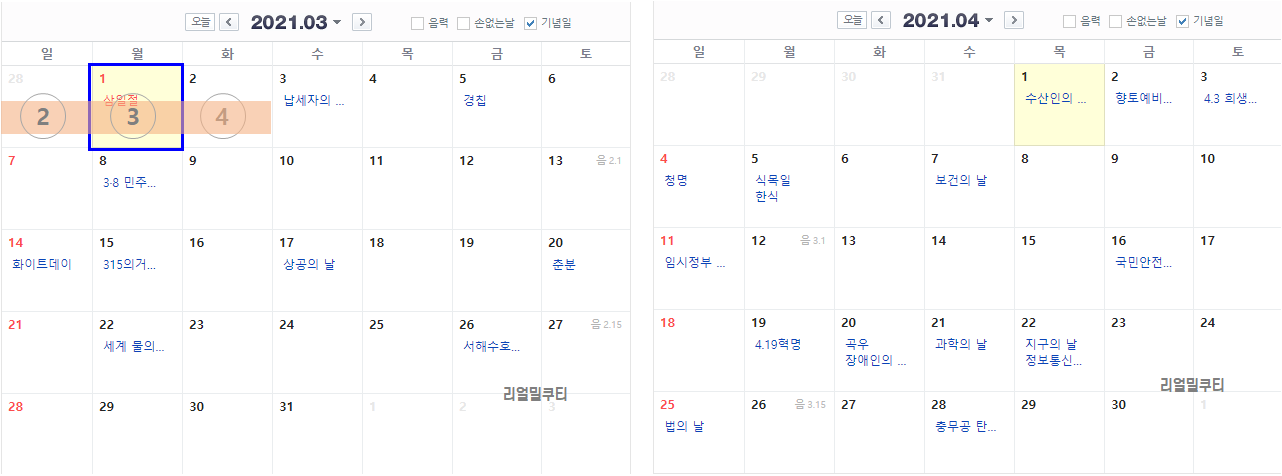 <3월 & 4월 달력>