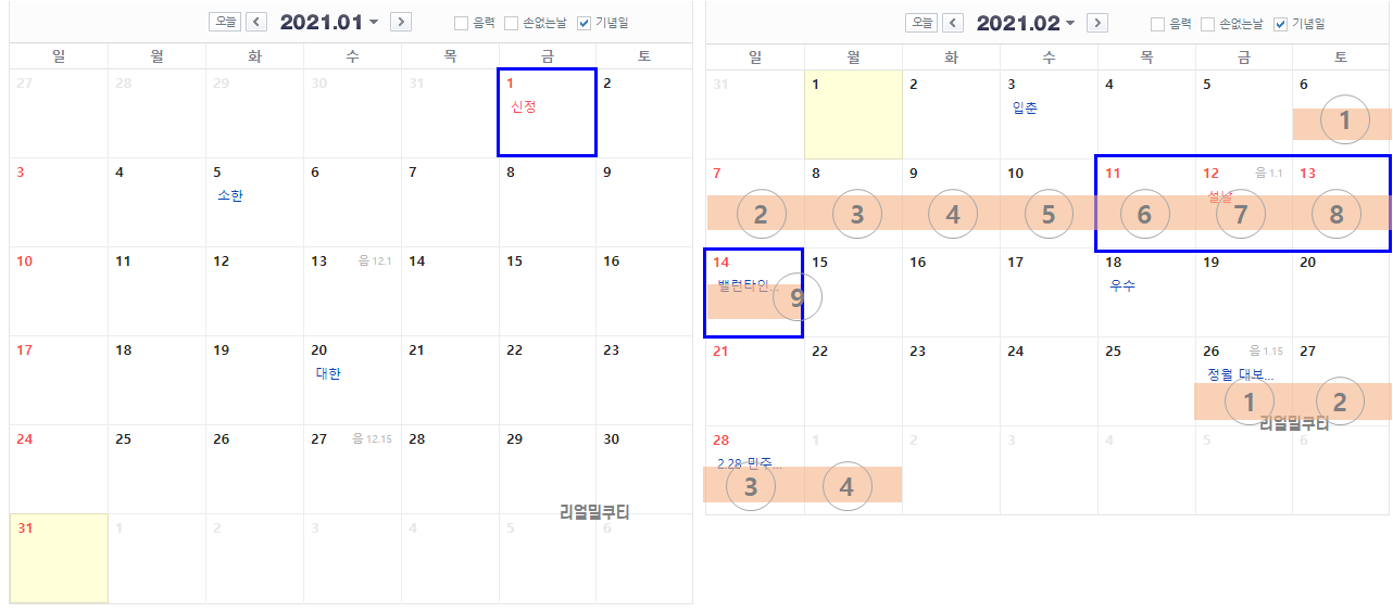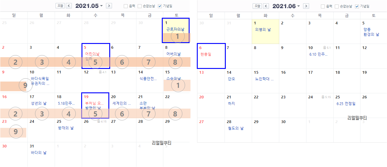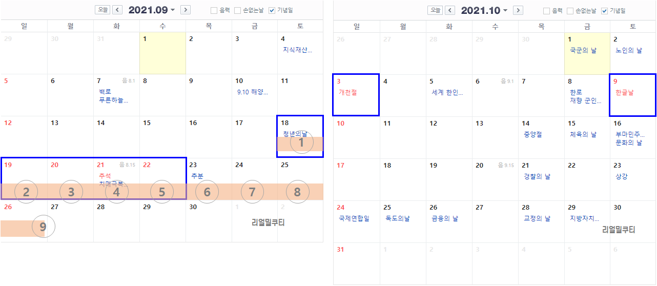 파란색 박스가 실제 쉬는 공휴일이고,