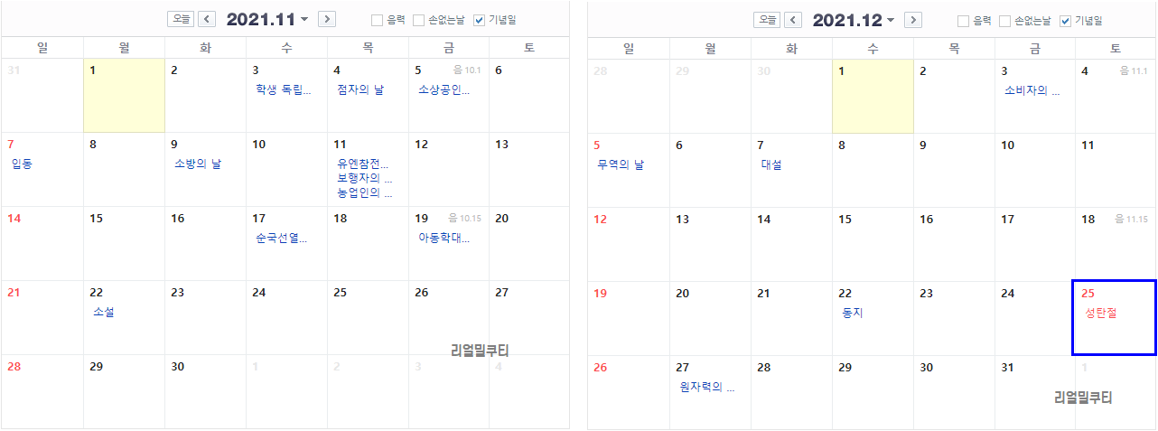 11월과 12월은 공휴일이 12월 25일 성탄절 뿐이에요.