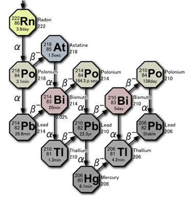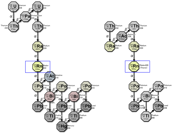 우라늄(또는 토륨)에서 방사성 붕괴로 라듐(Radium, Ra)이 생성되고 라듐이 핵분열 할 때 발생하는 것이 라돈(Radon, Rn)입니다.