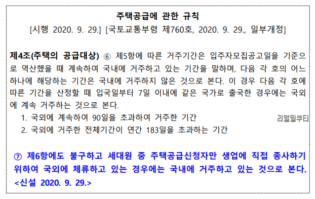 이전까지 생업으로 해외 근무 중인 사람은 우선공급 대상자에서 제외되고 있었습니다. 생업사정으로 인하여 홀로 해외에 체류한 청약신청자는 국내에 거주한 것으로 인정되는 예외 규정이 적용됩니다.