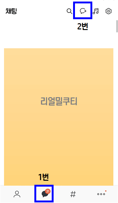 2. 하단에 1번 대화표시를 누릅니다. 그리고 2번 말풍선에 "+ 플러스 표시" 되어 있는 아이콘을 누릅니다.