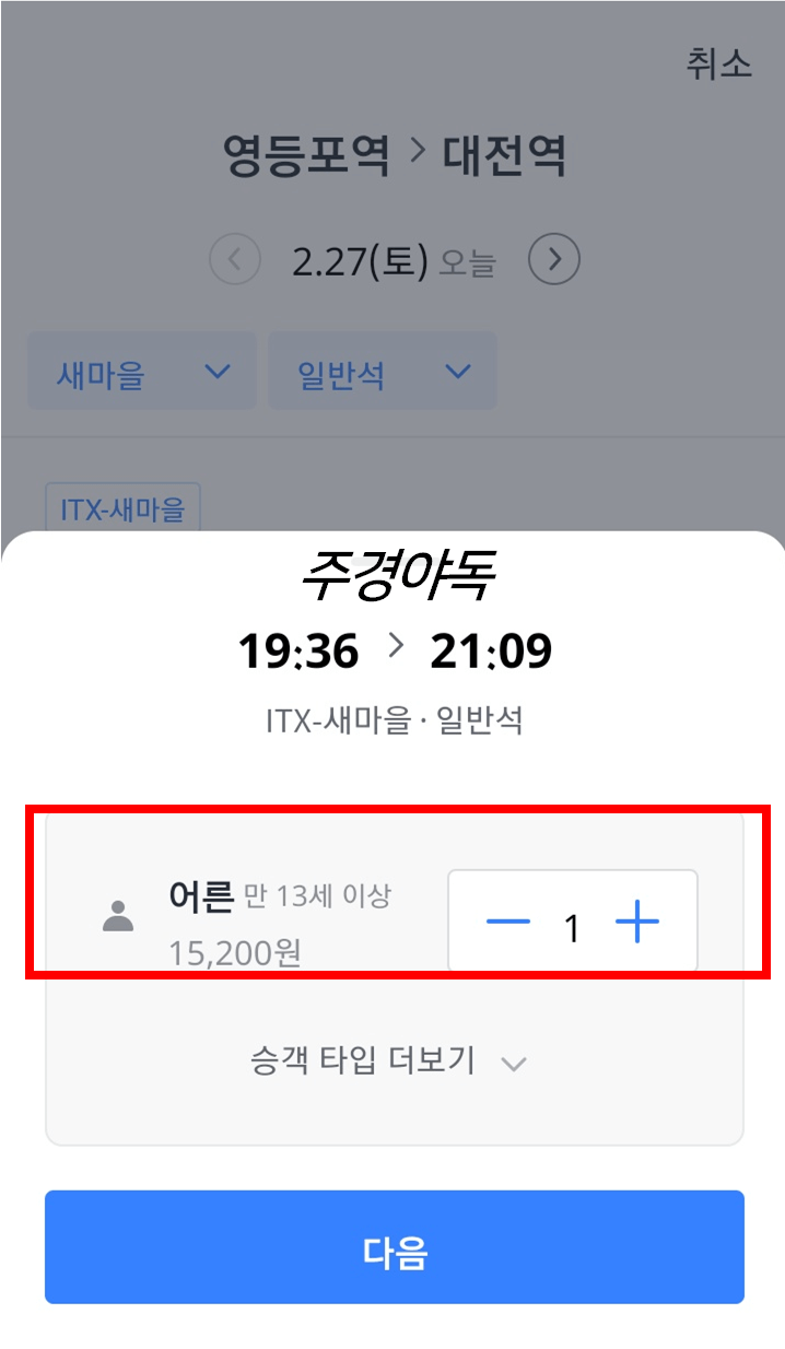 3. 원하는 시간의 기차를 선택 후 사람 인원 수를 선택합니다.