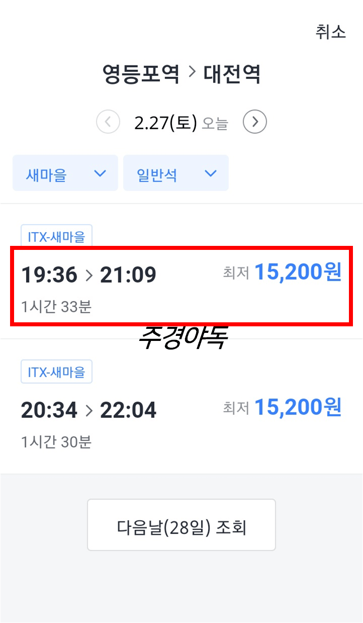 4. 원하는 시간 이후 출발기차 목록이 나옵니다.