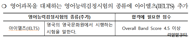 2. 영어과목을 대체하는 영어능력검정시험의 종류에 아이엘츠(IELTS)가 추가되었습니다.
