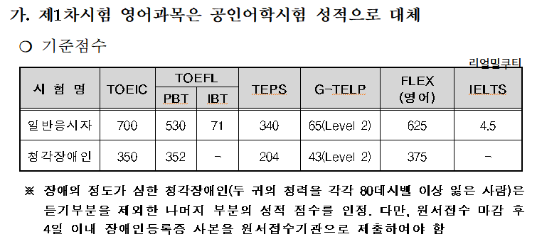 - 영어 – 영어능력 검정시험 성적으로 대체