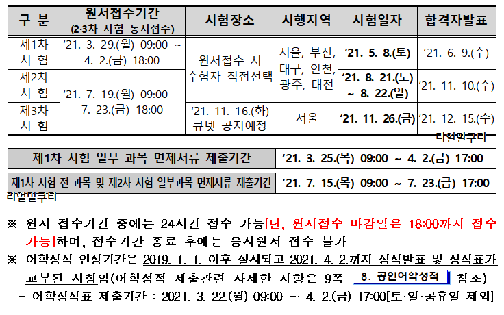 - 제2차 시험, 제3차 시험 원서 접수기간: 7월 19일 월요일 9시 ~ 7월 23일 금요일 오후 6시