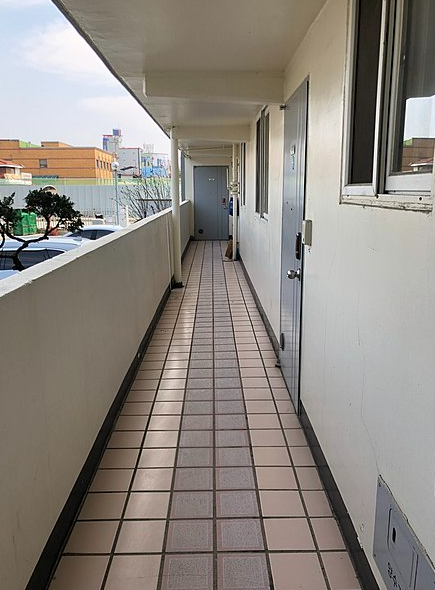같은 층의 여러 세대가 기다란 복도를 공동으로 사용하는 현관구조를 가진 아파트입니다.